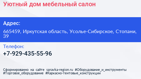 Уютный дом, мебельный салон по адресу 665459, Иркутская область, Усолье-Сибирское, Стопани, 39 в дальнейшем Организация, размещена в следующих категориях: