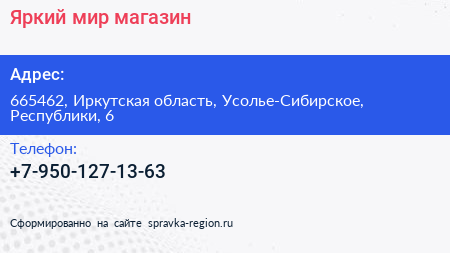 Яркий мир, магазин по адресу 665462, Иркутская область, Усолье-Сибирское, Республики, 6 в дальнейшем Организация, размещена в следующих категориях: