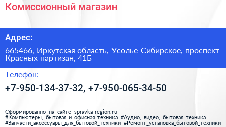 Комиссионный магазин по адресу 665466, Иркутская область, Усолье-Сибирское, проспект Красных партизан, 41Б в дальнейшем Организация, размещена в следующих категориях: