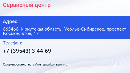 Сервисный центр по адресу 665466, Иркутская область, Усолье-Сибирское, проспект Космонавтов, 17 в дальнейшем Организация, размещена в следующих категориях: