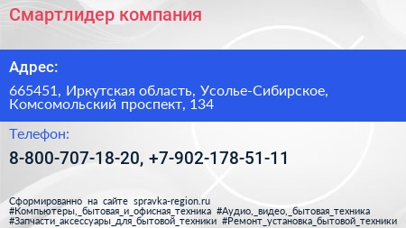 Смартлидер, компания по адресу 665451, Иркутская область, Усолье-Сибирское, Комсомольский проспект, 134 в дальнейшем Организация, размещена в следующих категориях: