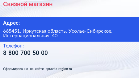 Связной, магазин по адресу 665451, Иркутская область, Усолье-Сибирское, Интернациональная, 40 в дальнейшем Организация, размещена в следующих категориях: