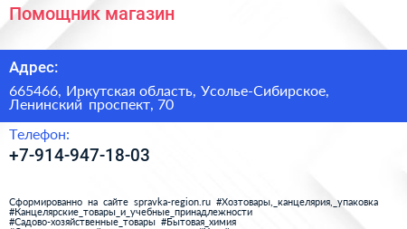 Помощник, магазин по адресу 665466, Иркутская область, Усолье-Сибирское, Ленинский проспект, 70 в дальнейшем Организация, размещена в следующих категориях: