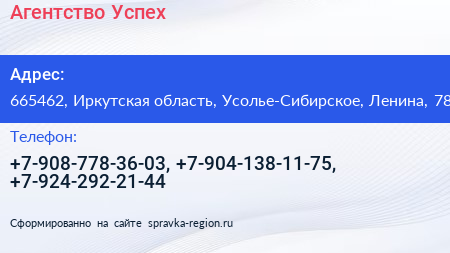 Агентство Успех по адресу 665462, Иркутская область, Усолье-Сибирское, Ленина, 78 в дальнейшем Организация, размещена в следующих категориях: