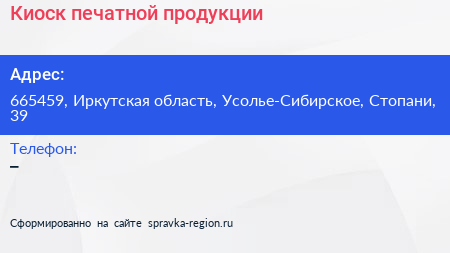 Киоск печатной продукции по адресу 665459, Иркутская область, Усолье-Сибирское, Стопани, 39 в дальнейшем Организация, размещена в следующих категориях: