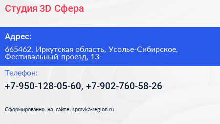 Студия 3D Сфера по адресу 665462, Иркутская область, Усолье-Сибирское, Фестивальный проезд, 13 в дальнейшем Организация, размещена в следующих категориях: