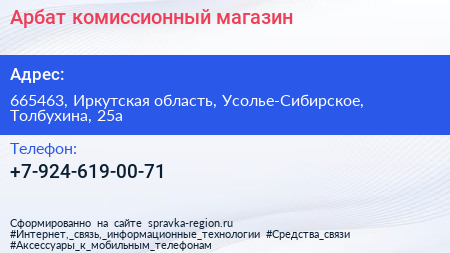 Арбат, комиссионный магазин по адресу 665463, Иркутская область, Усолье-Сибирское, Толбухина, 25а в дальнейшем Организация, размещена в следующих категориях: