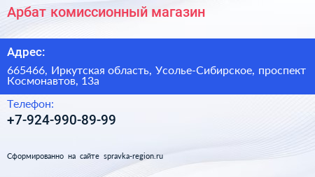 Арбат, комиссионный магазин по адресу 665466, Иркутская область, Усолье-Сибирское, проспект Космонавтов, 13а в дальнейшем Организация, размещена в следующих категориях: