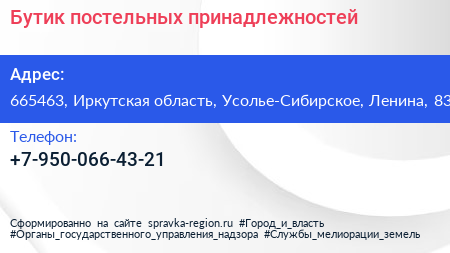 Бутик постельных принадлежностей по адресу 665463, Иркутская область, Усолье-Сибирское, Ленина, 83 в дальнейшем Организация, размещена в следующих категориях: