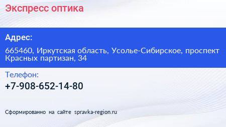 Экспресс-оптика по адресу 665460, Иркутская область, Усолье-Сибирское, проспект Красных партизан, 34 в дальнейшем Организация, размещена в следующих категориях: