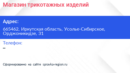Магазин трикотажных изделий по адресу 665462, Иркутская область, Усолье-Сибирское, Орджоникидзе, 31 в дальнейшем Организация, размещена в следующих категориях: