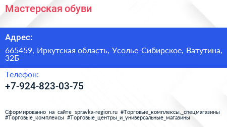 Мастерская обуви по адресу 665459, Иркутская область, Усолье-Сибирское, Ватутина, 32Б в дальнейшем Организация, размещена в следующих категориях: