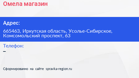 Омела, магазин по адресу 665463, Иркутская область, Усолье-Сибирское, Комсомольский проспект, 63 в дальнейшем Организация, размещена в следующих категориях: