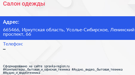 Салон одежды по адресу 665466, Иркутская область, Усолье-Сибирское, Ленинский проспект, 66 в дальнейшем Организация, размещена в следующих категориях: