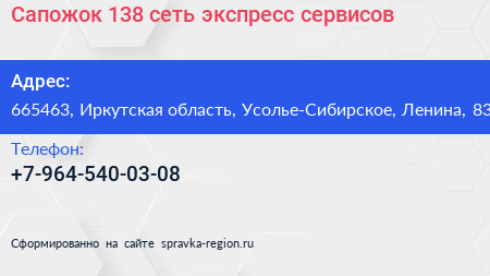 Сапожок 138, сеть экспресс-сервисов по адресу 665463, Иркутская область, Усолье-Сибирское, Ленина, 83 в дальнейшем Организация, размещена в следующих категориях:
