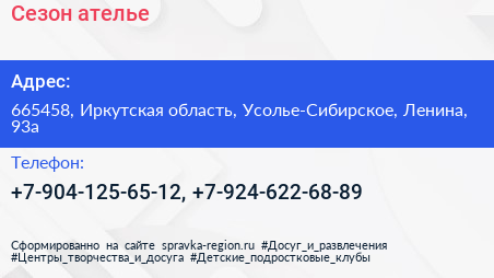 Сезон, ателье по адресу 665458, Иркутская область, Усолье-Сибирское, Ленина, 93а в дальнейшем Организация, размещена в следующих категориях: