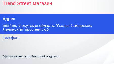 Trend Street, магазин по адресу 665466, Иркутская область, Усолье-Сибирское, Ленинский проспект, 66 в дальнейшем Организация, размещена в следующих категориях: