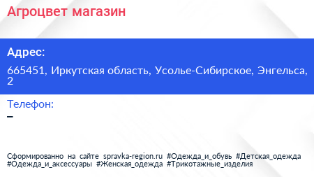 Агроцвет, магазин по адресу 665451, Иркутская область, Усолье-Сибирское, Энгельса, 2 в дальнейшем Организация, размещена в следующих категориях: