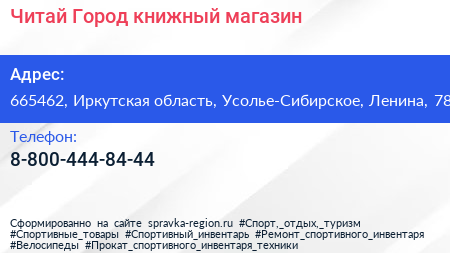 Читай-Город, книжный магазин по адресу 665462, Иркутская область, Усолье-Сибирское, Ленина, 78 в дальнейшем Организация, размещена в следующих категориях: