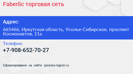 Faberlic, торговая сеть по адресу 665466, Иркутская область, Усолье-Сибирское, проспект Космонавтов, 11а в дальнейшем Организация, размещена в следующих категориях: