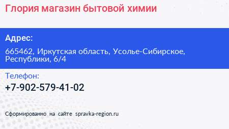 Глория, магазин бытовой химии по адресу 665462, Иркутская область, Усолье-Сибирское, Республики, 6/4 в дальнейшем Организация, размещена в следующих категориях: