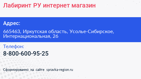 Лабиринт.РУ, интернет-магазин по адресу 665463, Иркутская область, Усолье-Сибирское, Интернациональная, 26 в дальнейшем Организация, размещена в следующих категориях: