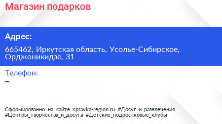 Магазин подарков по адресу 665462, Иркутская область, Усолье-Сибирское, Орджоникидзе, 31 в дальнейшем Организация, размещена в следующих категориях: