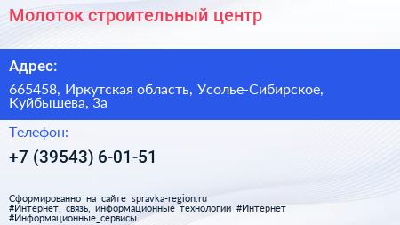 Молоток, строительный центр по адресу 665458, Иркутская область, Усолье-Сибирское, Куйбышева, 3а в дальнейшем Организация, размещена в следующих категориях: