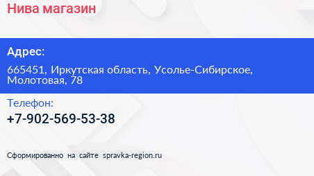 Нива, магазин по адресу 665451, Иркутская область, Усолье-Сибирское, Молотовая, 78 в дальнейшем Организация, размещена в следующих категориях: