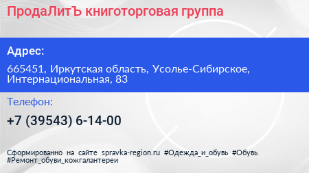 ПродаЛитЪ, книготорговая группа по адресу 665451, Иркутская область, Усолье-Сибирское, Интернациональная, 83 в дальнейшем Организация, размещена в следующих категориях: