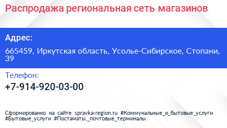 Распродажа, региональная сеть магазинов по адресу 665459, Иркутская область, Усолье-Сибирское, Стопани, 39 в дальнейшем Организация, размещена в следующих категориях: