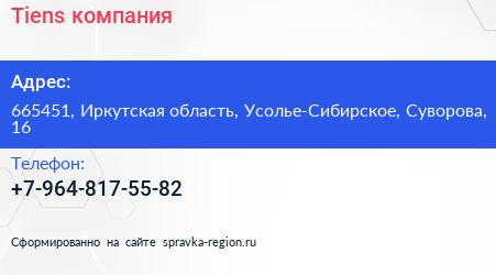Tiens, компания по адресу 665451, Иркутская область, Усолье-Сибирское, Суворова, 16 в дальнейшем Организация, размещена в следующих категориях: