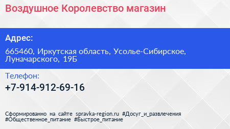 Воздушное Королевство, магазин по адресу 665460, Иркутская область, Усолье-Сибирское, Луначарского, 19Б в дальнейшем Организация, размещена в следующих категориях: