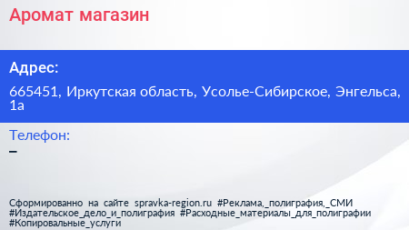 Аромат, магазин по адресу 665451, Иркутская область, Усолье-Сибирское, Энгельса, 1а в дальнейшем Организация, размещена в следующих категориях: