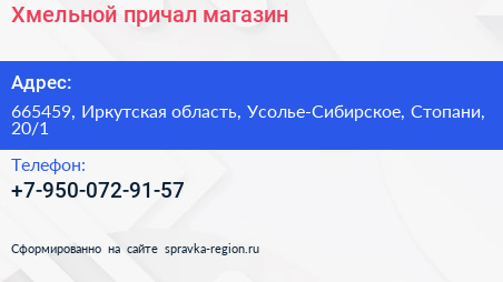 Хмельной причал, магазин по адресу 665459, Иркутская область, Усолье-Сибирское, Стопани, 20/1 в дальнейшем Организация, размещена в следующих категориях: