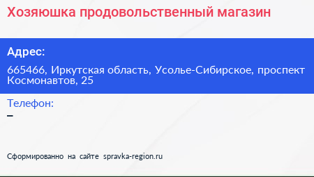 Хозяюшка, продовольственный магазин по адресу 665466, Иркутская область, Усолье-Сибирское, проспект Космонавтов, 25 в дальнейшем Организация, размещена в следующих категориях:
