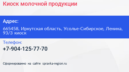 Киоск молочной продукции по адресу 665458, Иркутская область, Усолье-Сибирское, Ленина, 93/3 киоск в дальнейшем Организация, размещена в следующих категориях: