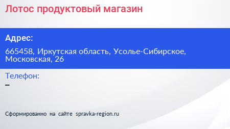 Лотос, продуктовый магазин по адресу 665458, Иркутская область, Усолье-Сибирское, Московская, 26 в дальнейшем Организация, размещена в следующих категориях: