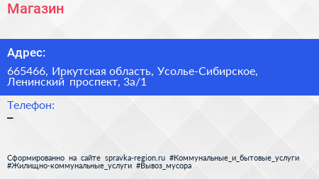 Магазин по адресу 665466, Иркутская область, Усолье-Сибирское, Ленинский проспект, 3а/1 в дальнейшем Организация, размещена в следующих категориях:
