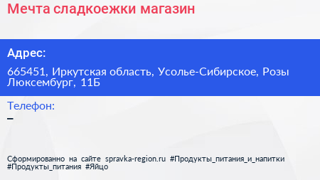 Мечта сладкоежки, магазин по адресу 665451, Иркутская область, Усолье-Сибирское, Розы Люксембург, 11Б в дальнейшем Организация, размещена в следующих категориях: