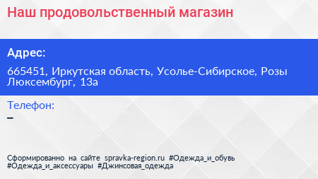 Наш, продовольственный магазин по адресу 665451, Иркутская область, Усолье-Сибирское, Розы Люксембург, 13а в дальнейшем Организация, размещена в следующих категориях: