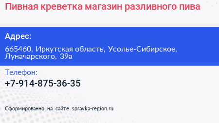 Пивная креветка, магазин разливного пива по адресу 665460, Иркутская область, Усолье-Сибирское, Луначарского, 39а в дальнейшем Организация, размещена в следующих категориях:
