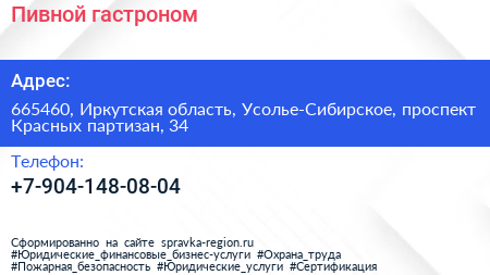 Пивной гастроном по адресу 665460, Иркутская область, Усолье-Сибирское, проспект Красных партизан, 34 в дальнейшем Организация, размещена в следующих категориях: