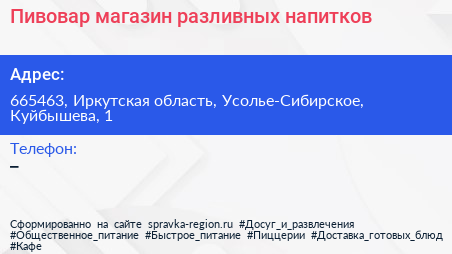 Пивовар, магазин разливных напитков по адресу 665463, Иркутская область, Усолье-Сибирское, Куйбышева, 1 в дальнейшем Организация, размещена в следующих категориях: