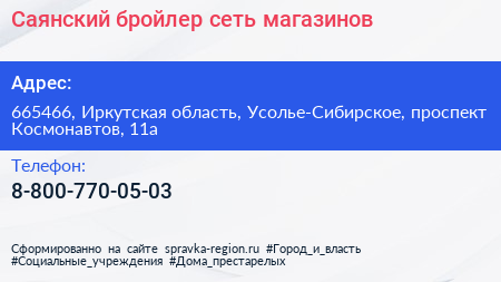 Саянский бройлер, сеть магазинов по адресу 665466, Иркутская область, Усолье-Сибирское, проспект Космонавтов, 11а в дальнейшем Организация, размещена в следующих категориях: