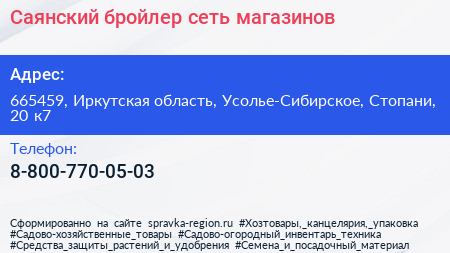Саянский бройлер, сеть магазинов по адресу 665459, Иркутская область, Усолье-Сибирское, Стопани, 20 к7 в дальнейшем Организация, размещена в следующих категориях: