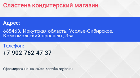 Сластена, кондитерский магазин по адресу 665463, Иркутская область, Усолье-Сибирское, Комсомольский проспект, 35а в дальнейшем Организация, размещена в следующих категориях: