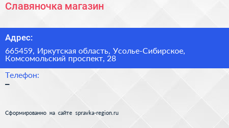 Славяночка, магазин по адресу 665459, Иркутская область, Усолье-Сибирское, Комсомольский проспект, 28 в дальнейшем Организация, размещена в следующих категориях: