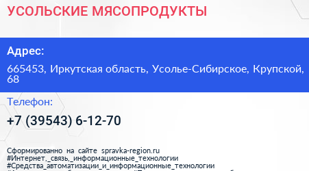 УСОЛЬСКИЕ МЯСОПРОДУКТЫ по адресу 665453, Иркутская область, Усолье-Сибирское, Крупской, 68 в дальнейшем Организация, размещена в следующих категориях: