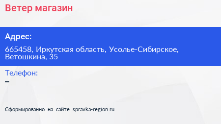 Ветер, магазин по адресу 665458, Иркутская область, Усолье-Сибирское, Ветошкина, 35 в дальнейшем Организация, размещена в следующих категориях: